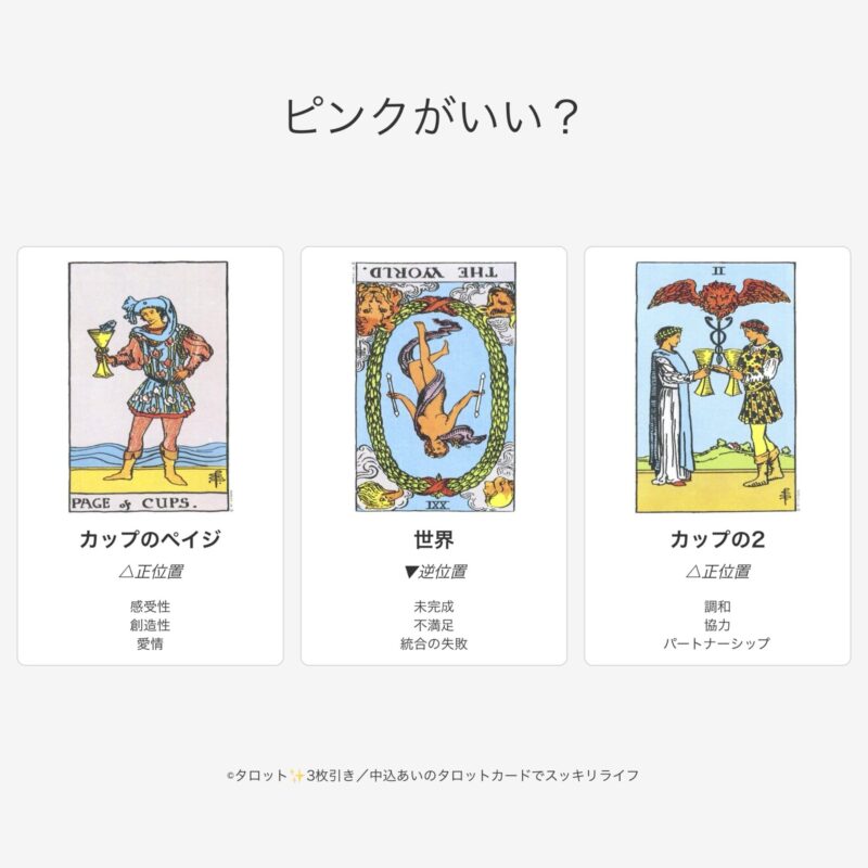 ピンクに「世界〜THE WORLD〜・逆位置」が出ているのはね、